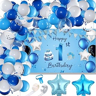 1. Geburtstag Dekorationen Erster Geburtstag Junge Hintergrund 86 Stücke Blau Baby Jungen Erster Geburtstag Party Zubehör mit Banner Folien Stern Luftballons Set für Baby Shower