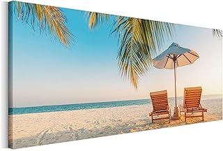 Revolio 150x60 cm Panorama Bilder Leinwandbild Wandbilder Wohnzimmer Modern Kunstdruck Design Wanddekoration Deko Bild auf Leinwand 1 Teilig - Strand Liegestühle Palme Blau braun