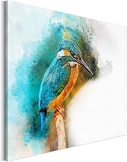 Revolio 50x50 cm Leinwandbild Wandbilder Wohnzimmer Modern Kunstdruck Design Wanddekoration Deko Bild auf Leinwand Bilder 1 Teilig - Eisvogel Tiere Zweig blau orange