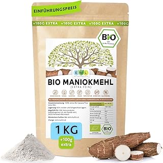 Maniokmehl Bio Cassava Mehl │1000g +100g extra XXL Vorteilspack 1,1kg│Paleo, Glutenfreies Mehl, Vegan, keine Gentechnik, kontrollierte Bio Qualität│kontrolliert und abgefüllt in Deutschland