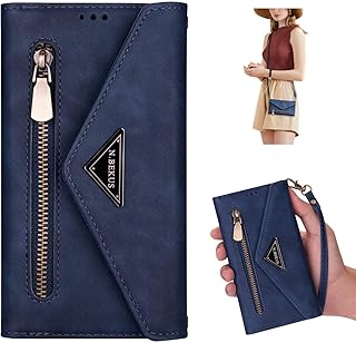 Uposao Kompatibel mit Samsung Galaxy J6 2018 Handykette Hülle Wallet Leder Hülle Klapphülle Brieftasche Schutzhülle Geldbörse Flip Case Kartenfach Reißverschluss für Mädchen Frauen,Blau