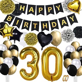 Geburtstagsdeko 30 Schwarz Gold, 30. Geburtstag Jungen Mann mit Happy Birthday Banner, Pompoms, Luftballons 30, Luftballons Metallic Gold Schwarz Weiß, Star Folienballons und konfetti ballons
